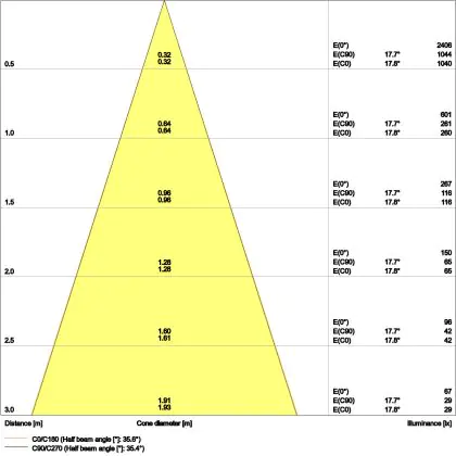 De lichtopbrengst en de gradenbundel spelen een grote rol. Zo geeft de lichtopbrengst van 320 Lumen in combinatie met de 36° stralingshoek deze inbouwspot een specifieke toepassing. Kort samengevat is een lichtintensiteit van maximaal 400 Lumen ideaal voor accentverlichting, terwijl hogere waardes goed gebruikt kunnen worden als basisverlichting. Over het algemeen geldt: hoe breder de gradenbundel, hoe geschikter deze is door basisverlichting. Dit komt doordat het licht over een groter oppervlak wordt verspreid. Smallere gradenbundels (tot 40°) kunnen echter bij hoge plafonds ook goed tot hun recht komen als algemene verlichting.