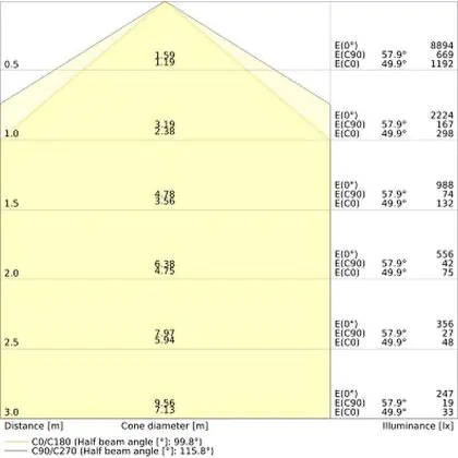 De lichtopbrengst (Lumen), geeft weer hoe krachtig het uitgestraalde licht is. Dit is belangrijk om te weten om de juiste sfeer te creëren. 0 tot 400 Lumen is bij uitstek geschikt voor accent- of sfeerverlichting. Een hoger aantal Lumen is, afhankelijk van de grootte van de ruimte, beter geschikt als ondersteunende- of basisverlichting. Heb je plafonds hoger dan 4 meter, dan is een lichtopbrengst van minimaal 8000lm aan te raden indien heldere verliching gewenst is (vb. in werkomgevingen).